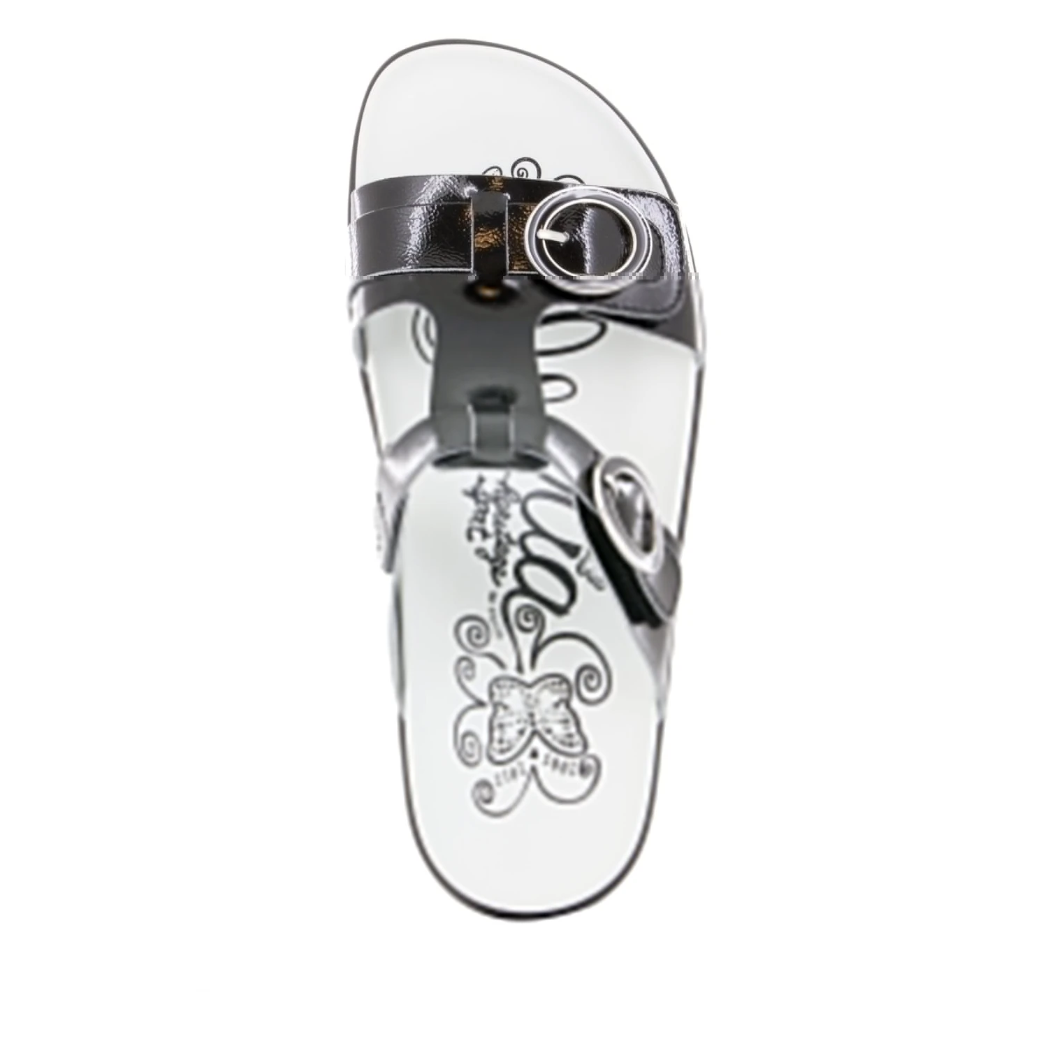 This two strap adjustable t-strap platform sandal is featured in Black Patent vegan leather with contrasting footbed, a dynamic combination to showcase your own unique personality.